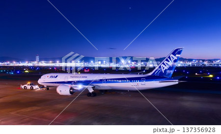 たそがれの福岡空港で離陸準備中の全日空(ANA)ボーイング787-9型旅客機