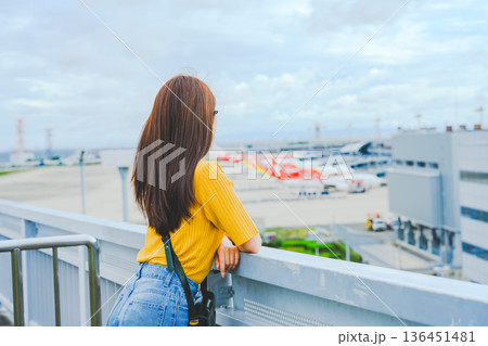 空港展望デッキで飛行機を眺める女性 ■撮影協力:関西国際空港(KIX)