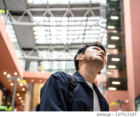 旅行中の男性、上を見上げる ■撮影協力:関西国際空港(KIX)