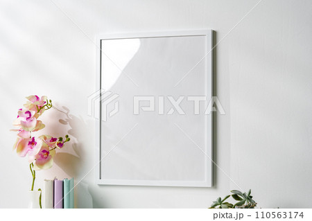 Modern white frame with a minimalist bowl and orange. Contemporary interior design concept