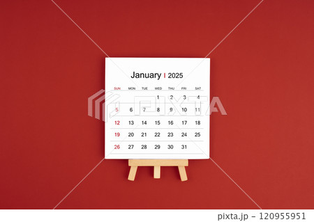January 2025 desk calendar on red background.