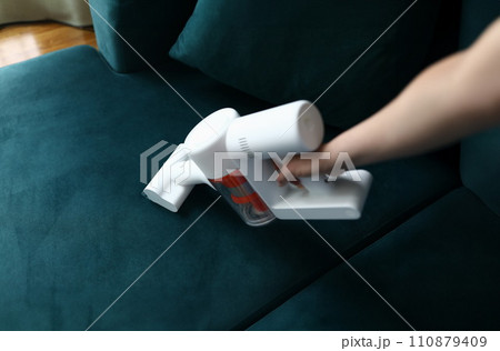 Hand vacuums upholstered furniture in apartment