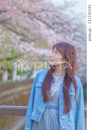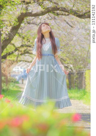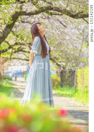 満開の桜バックに中年女性ポートレート