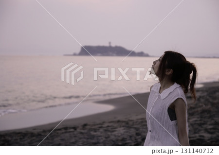 湘南海岸・夕暮れの海辺の一人の女性