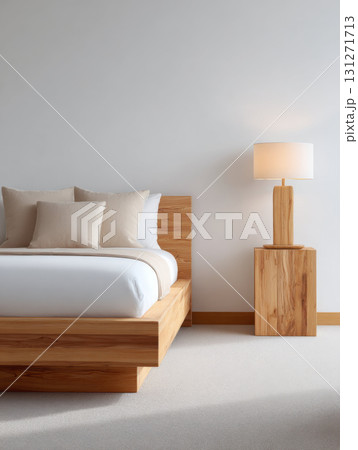 Calm and tranquil minimalist bedroom interior design with modern wooden furniture. cozy platform bed and warm lamp create serene and peaceful atmosphere for relaxation
