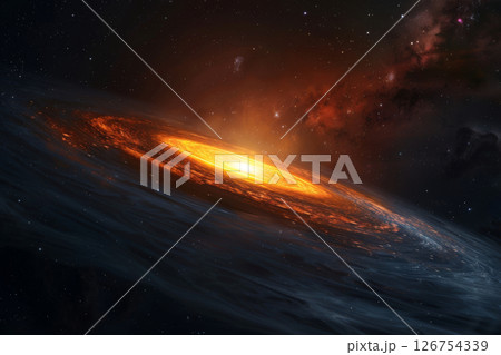 Golden and crimson nebula swirling in cosmic patterns, illuminated by a radiant central star, with glowing interstellar clouds and distant stars creating a breathtaking celestial scene