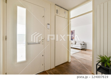 A stylish interior entrance with a white door and bright, natural light highlighting a cozy living space beyond. The wooden floor adds warmth to the contemporary design.
