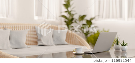 A laptop computer on a coffee table in a bright Scandinavian living room. back view image