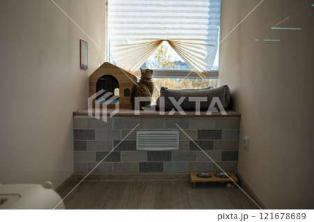 Curious cat sit by window in pet hotel room, surrounded by house. Animal hotel, feline solitude
