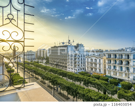 チュニジア・朝日に照らされるチュニス新市街の大通り / Tunis, Tunisia