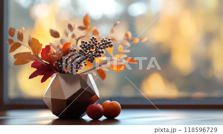 AUTUMN VIBES text greeting card concept Celebrating autumn holidays at cozy home on the windowsill Hygge aesthetic atmosphere Autumn leaves spices and candle on knitted white sweater in warm yellow