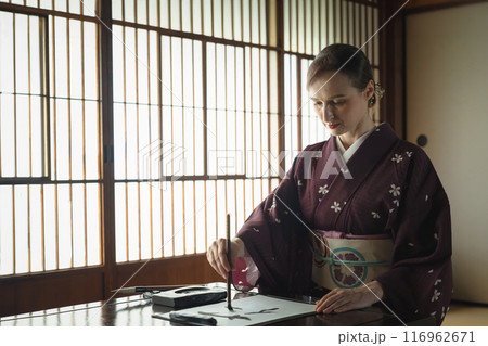 書道をする外国人女性