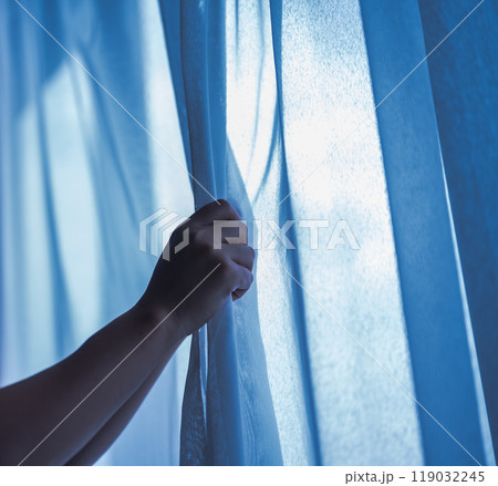 カーテンを開けるミドル女性