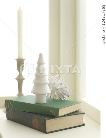 明るい窓辺に飾り付けられたクリスマスイメージ