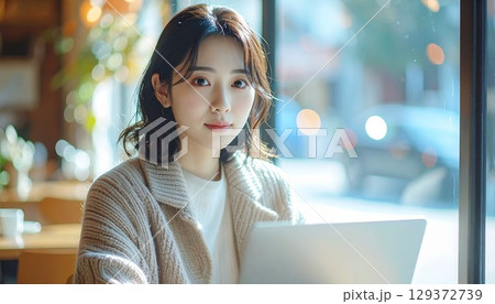 明るいカフェの窓際でノートパソコンを使う若い日本人女性