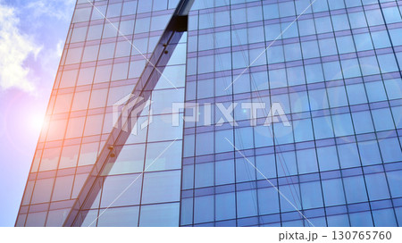 Background shot of building cradle hanging outside business building while worker installing facade elements, copy space