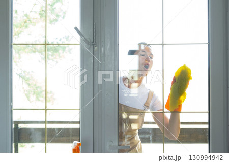 Woman in rubber gloves and apron manually washes window of house in bathroom with rag cleaner and mop inside interior with home plants. Restoring order and cleanliness, cleaning servise