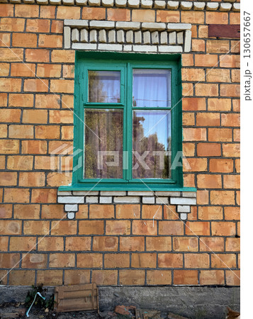 Old window with a cup of tea on brick wall are an advertisement for a vintage tea shop.