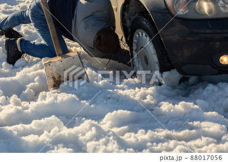 立ち往生した車のマフラー付近の除雪作業を行っている人のイメージ素材