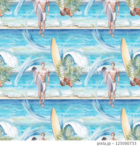 Seamless pattern with a surfer, sea and sand. Watercolor illustration on a turquoise background on the theme of active recreation for printing on posters, fabrics, restaurant design, sports stores.
