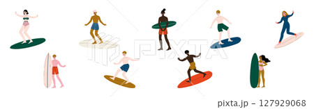 Man and Woman Surfer in Swimwear on Surfboard Vector Set
