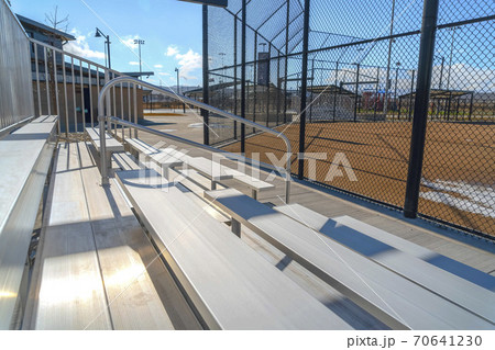 Tiered bleachers with metal handrail at a sports field viewed on a sunny day