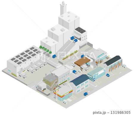アイソメトリック都市の街並み(ごみ処理施設や倉庫のある街並み)