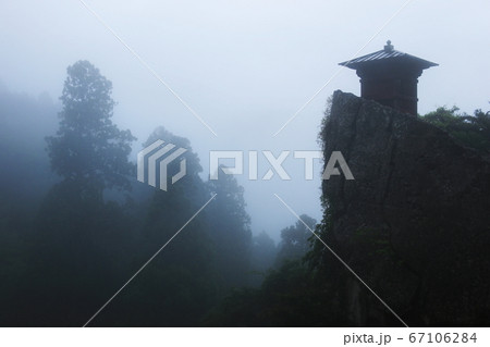 山形の梅雨 雨の山寺(立石寺) 雲に煙る納経堂