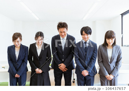 挨拶する会社・企業に勤める5人のスーツ姿のビジネスマン・ビジネスウーマン(お辞儀・感謝・歓迎)