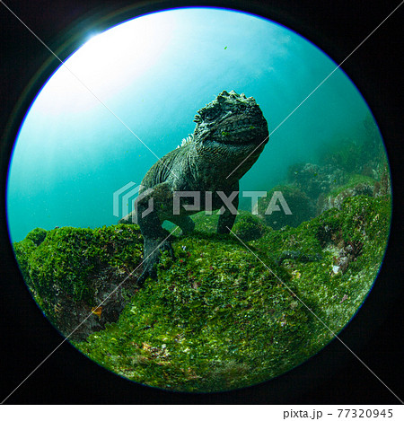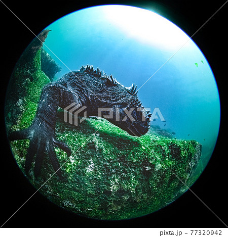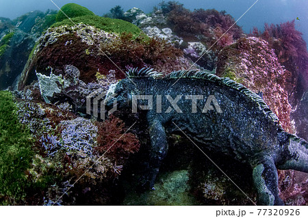 ご馳走の海藻を満足そうに食べるウミイグアナ