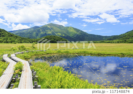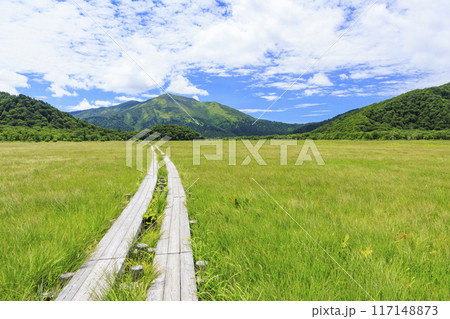 夏の群馬県片品村の尾瀬の中田代から龍宮小屋方面を見る