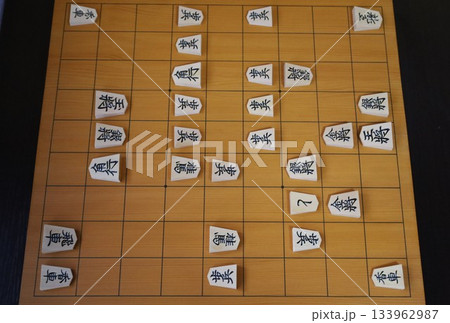 明るい光の中の将棋盤の上に並んだ将棋の駒