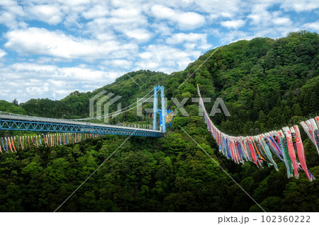 茨城県常陸太田市 新緑の竜神大吊り橋と鯉のぼり