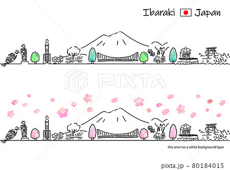 春の茨城の街並みのシンプル線画セット