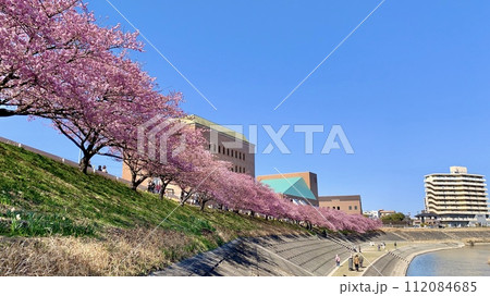 満開の桜並木(河津桜)と竜美丘会館〈乙川堤防/愛知県岡崎市〉