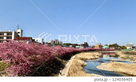 満開の桜並木(河津桜)と青空[乙川/愛知県岡崎市]