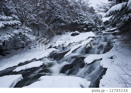 粉雪が降り積もる樹々と渓流:八重滝周辺(島根県雲南市)