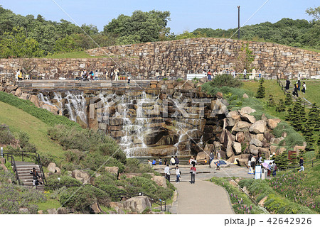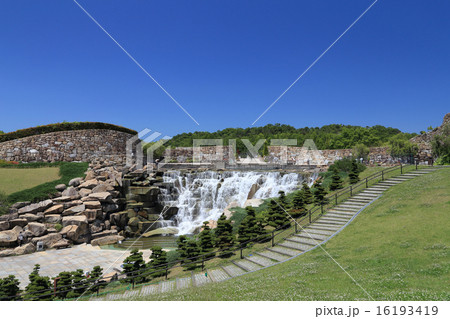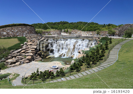 国営讃岐まんのう公園、竜頭の里の「昇竜の滝」とエントランス広場へ続く「緑と石のヴィスタ」