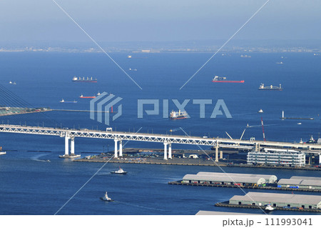 日本の横浜都市景観 大黒ふ頭(右)を離れた自動車船VICTORIA HIGHWAYや扇島などを望む