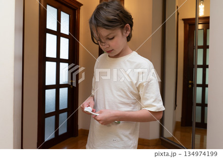 Young boy applying toothpaste to his toothbrush. Daily dental care and hygiene routine