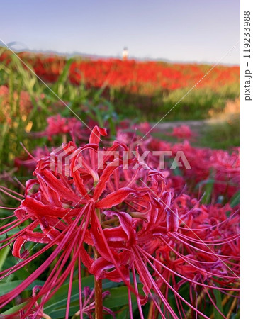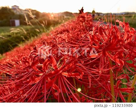 土手に咲き乱れる彼岸花の夕景〈矢勝川/愛知県半田市〉