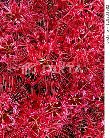 土手の斜面に咲き誇る彼岸花(クローズアップ)〈矢勝川堤/愛知県半田市〉
