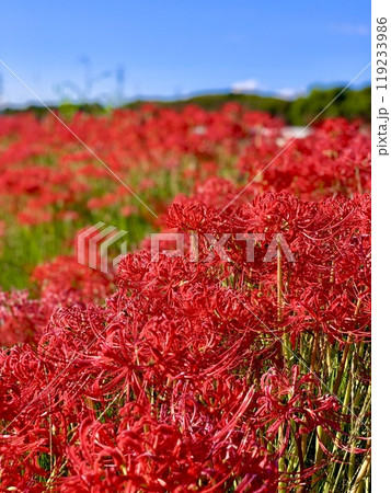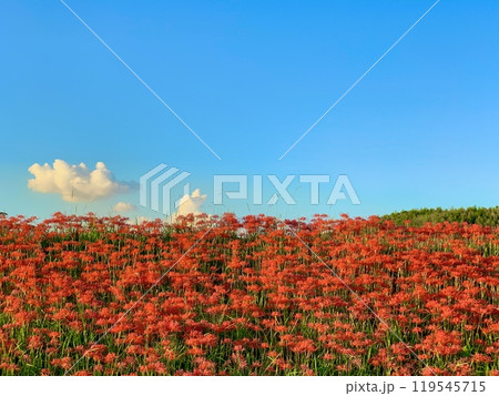秋晴れの青空の下、土手の斜面に咲き誇る彼岸花〈矢勝川堤/愛知県半田市〉
