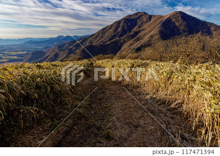 朝霧高原から見る初冬の竜ヶ岳と飛行機雲
