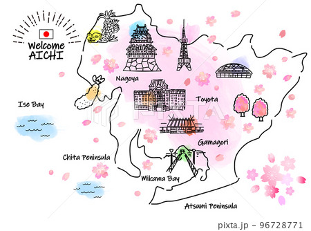 春の愛知県の観光地のシンプル線画イラストマップ(ピンク)