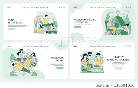 Vector illustration set depicting wellness activities and healthy cooking. Scenes include yoga in the park, wellness travel, a picnic, and group cooking showcasing joyful interactions.