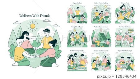 Vector illustration set depicting friends engaging in wellness activities like yoga, hiking, and cooking. Each scene highlights fun, relaxation, and togetherness in nature-focused settings.