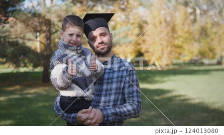 A proud graduate joyfully holds his son in a vibrant park, capturing a moment of achievement and happiness