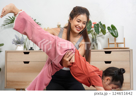 Family Activity and Fun. A joyful adult lifts a child during a playful yoga session, enhancing bonding and laughter.