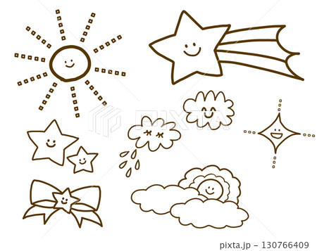 POPでシンプルな手書きイラストのセット|スマイル 太陽 星 雲 流れ星 リボン 魔法少女